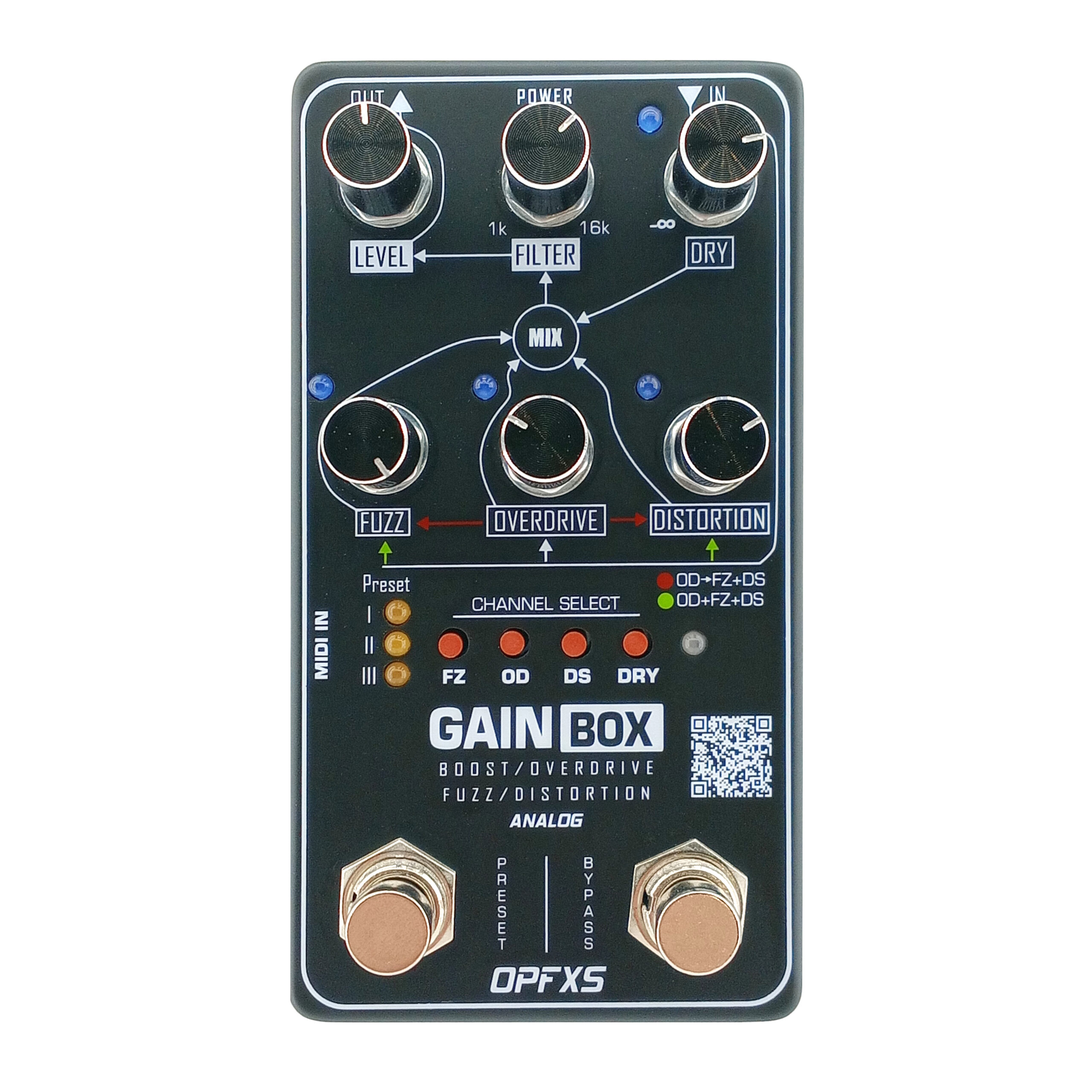 The Gain Box is a fully analog, multi‑channel distortion pedal with digital control and preset recall. Designed for players who want maximum tonal flexibility without sacrificing analog character, it combines three distinct distortion stages, a blendable dry path, a variable low‑pass filter, and a global output level in a compact enclosure.